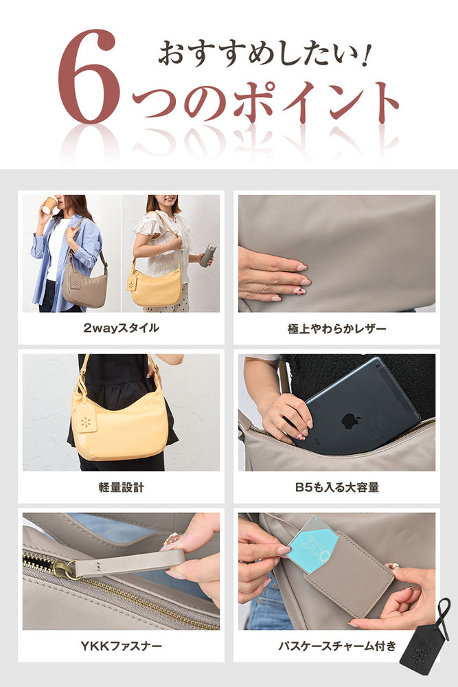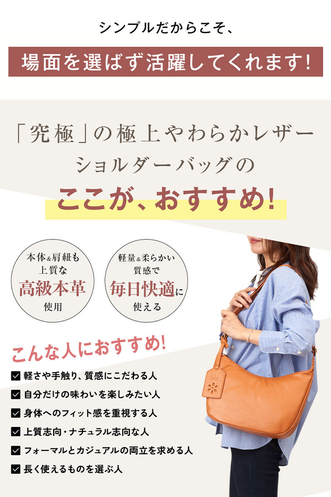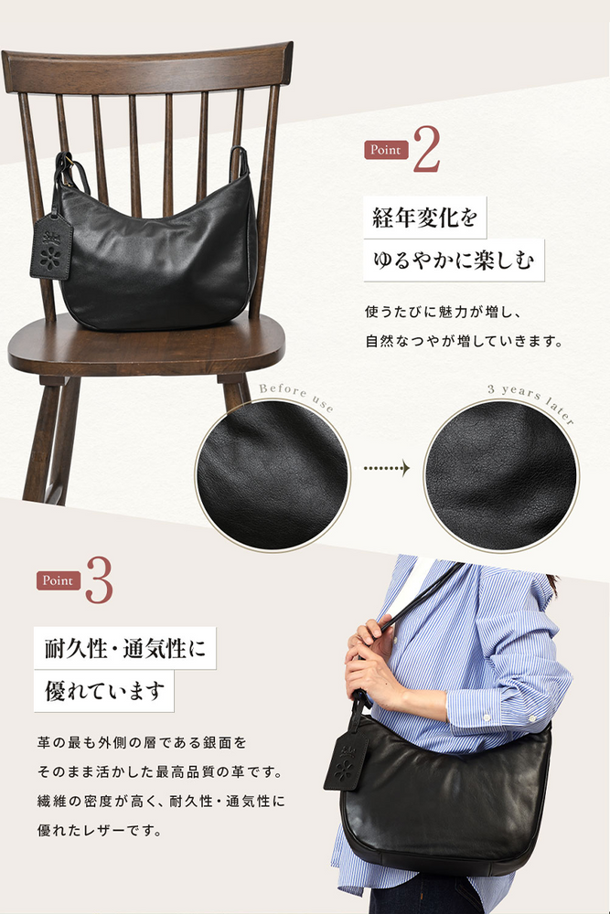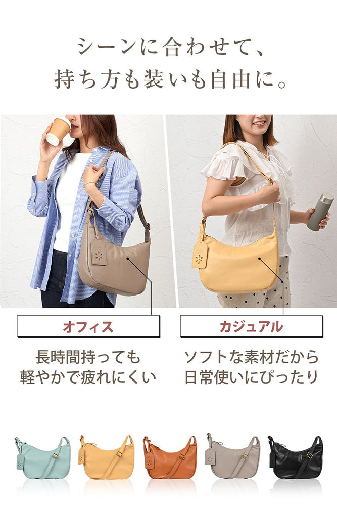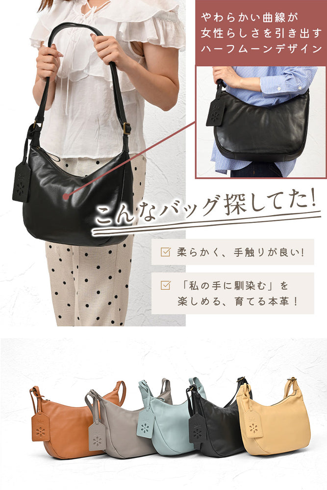 今人気のムーンショルダー型バッグ。上質な牛革を使用し、ナチュラルな風合いに仕上げました。