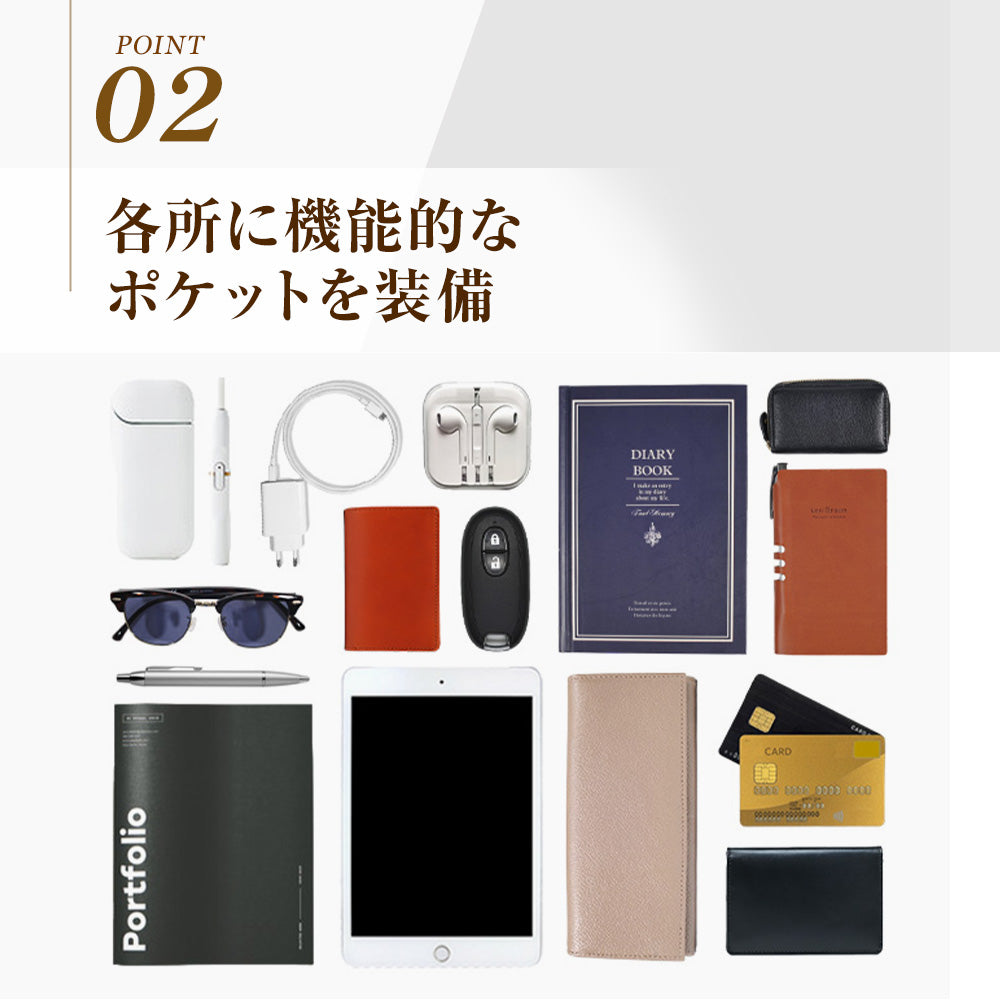 サッと持ちに便利なトップハンドルや小物の収納に便利な前面の2段ポケットなど機能も充実。メインルームはスラント(斜め)ファスナーで小柄なボディでも開口を確保していますので、出し入れのストレスがありません。