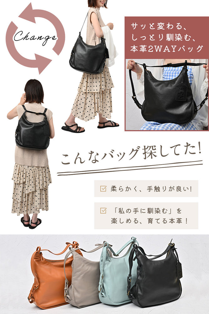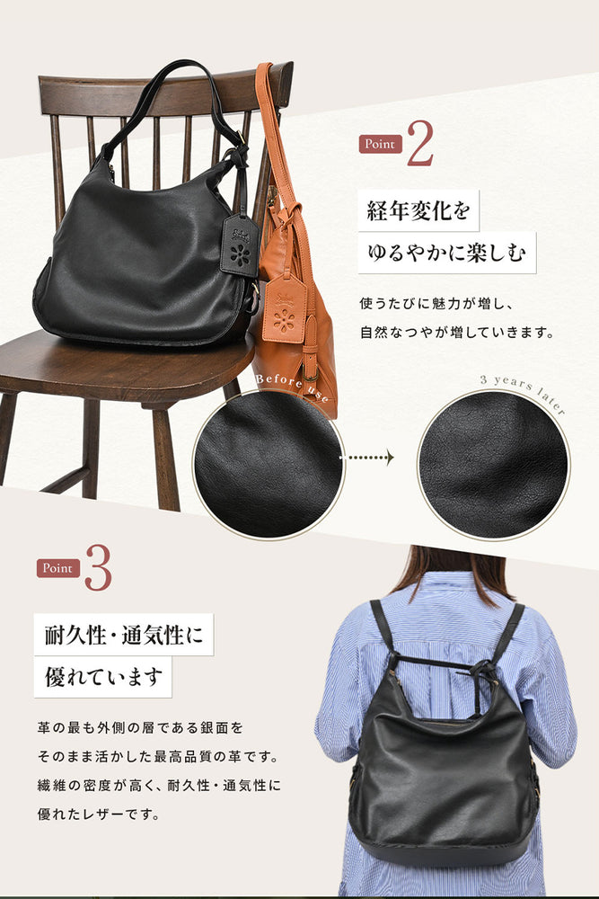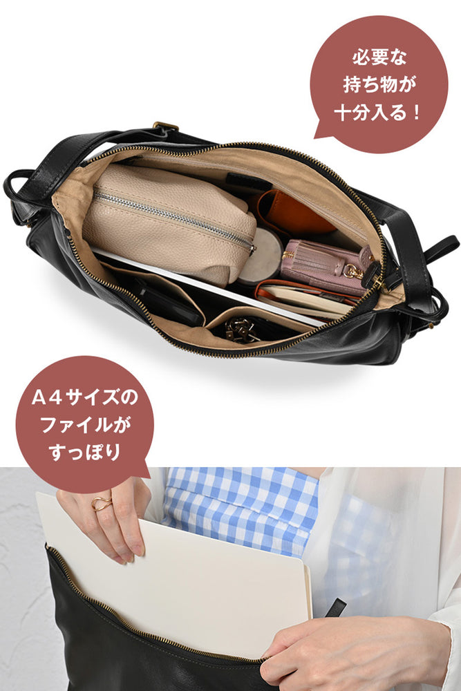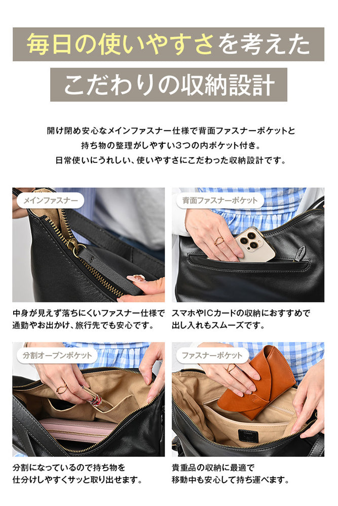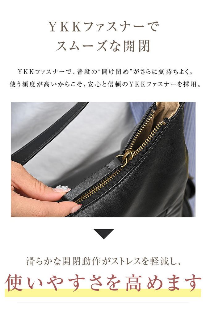 軽量で扱いやすい革はデイリーに活躍してくれます。開口部はファスナーで開閉し、大開口で内装生地も明るく、中身が見やすい作りとなっています。レザーと嫌味にならないアンティークゴールドのパーツの組み合わせがナチュラルな雰囲気を演出します。