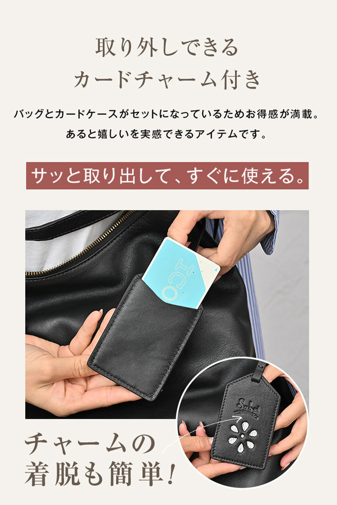 取り外し可能なパスケースチャームが付属します。内装は細かい荷物も見やすい明るいベージュのコットン生地を採用。